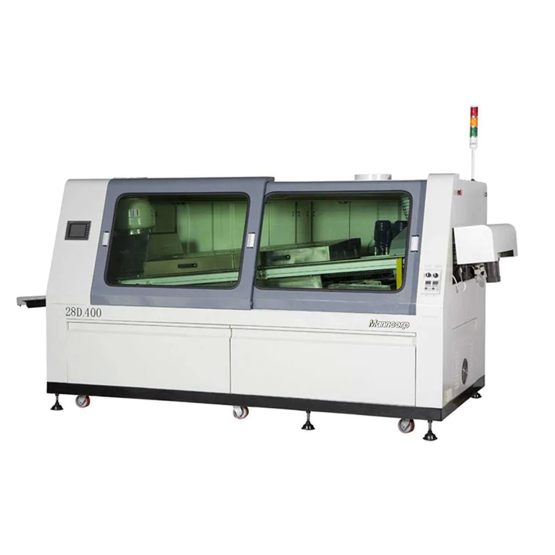 Designed for intermediate to heavy throughput requirements, the Model 28.400 wave solder machine features an auto-cleaning titanium finger conveyor with motorized width adjustment that handles PCBs up to 15.75″ (400 mm) wide.